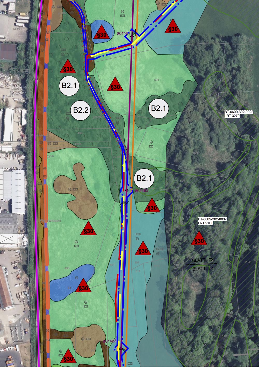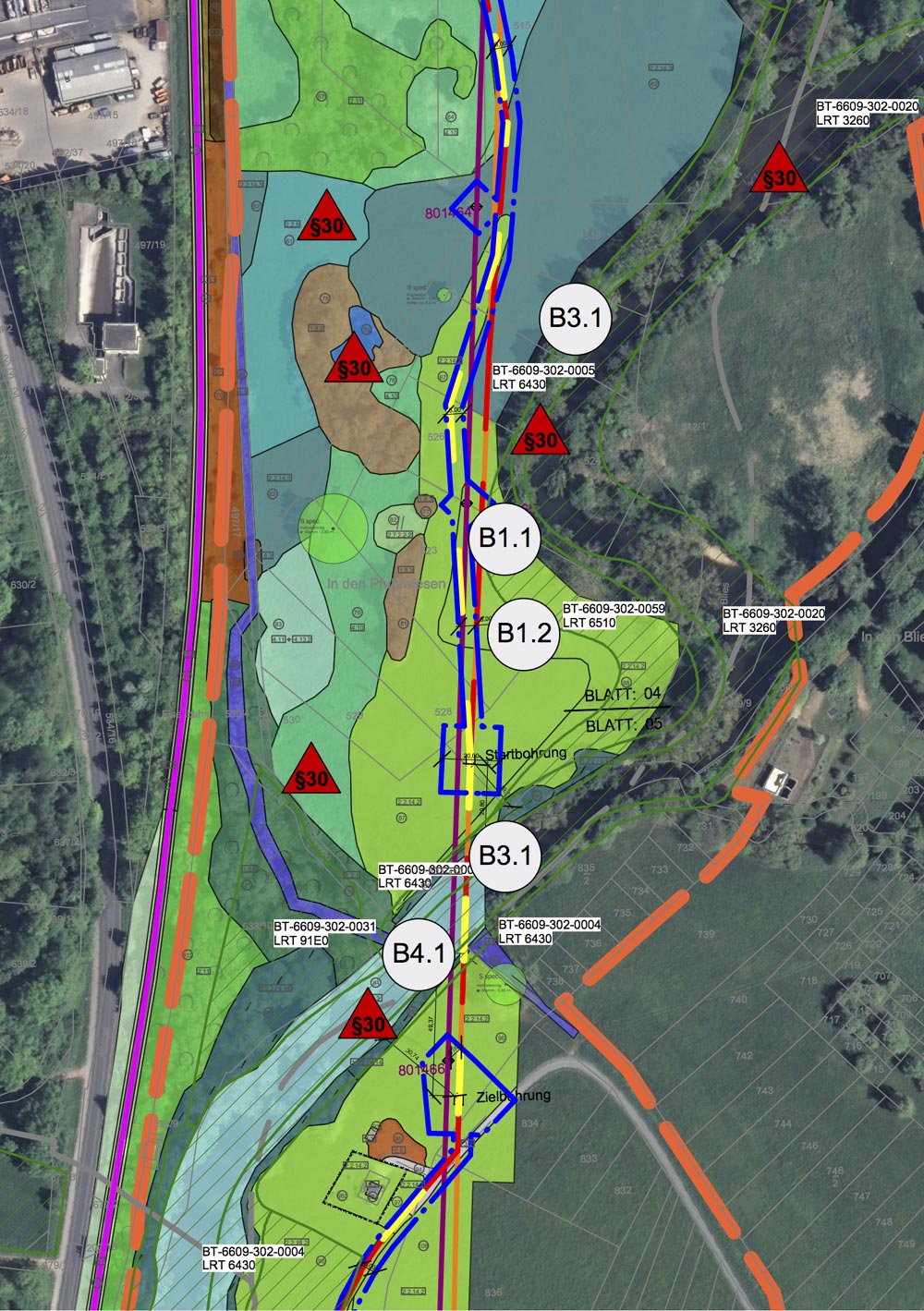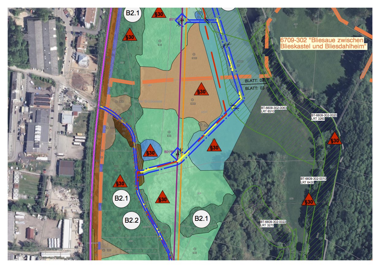An diesem Standort befinden sich nach §30 BNatSchG geschützte Biotope, Auenlandschaft mit Schilfröhricht, Unterquerung der Blies mit Start- und Zielgrube.