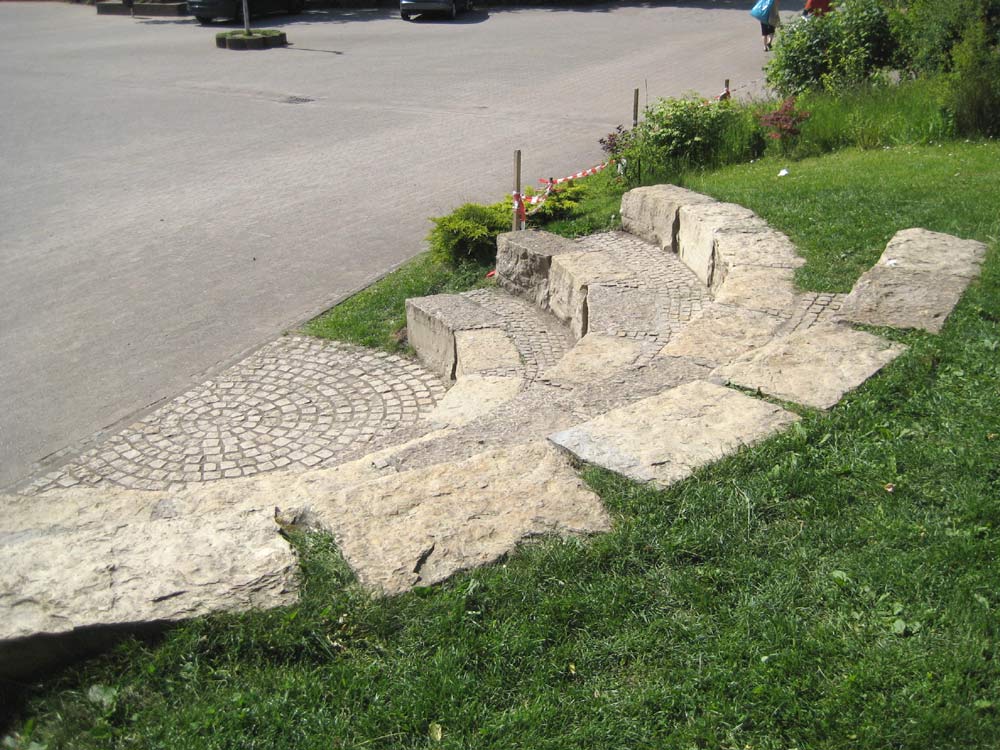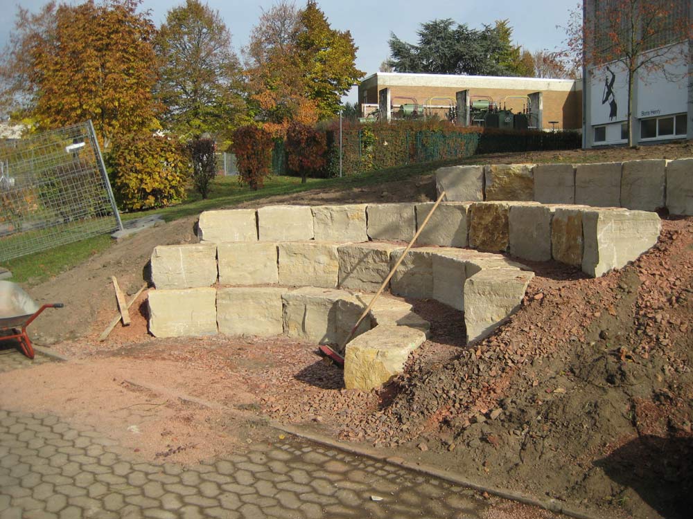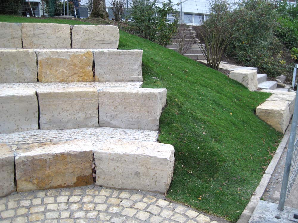 Sitzbankstufen aus Dolomitkalkstein, Versetzen im Halbrund, Gehölzpflanzung