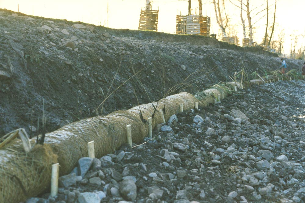 - Weiterführung der Böschungsfußsicherung mit bepflanzten Kokoswalzen über dem Wasserspiegel